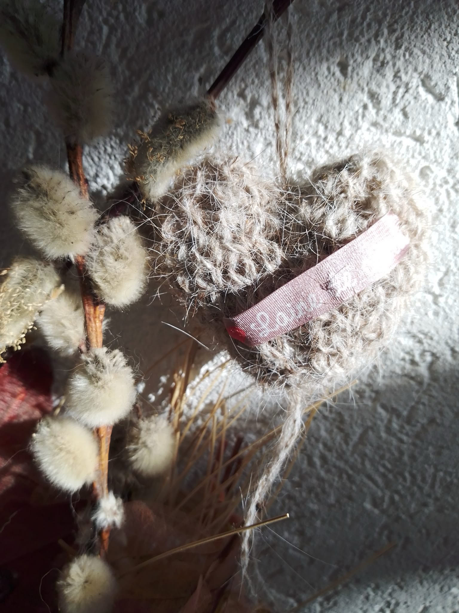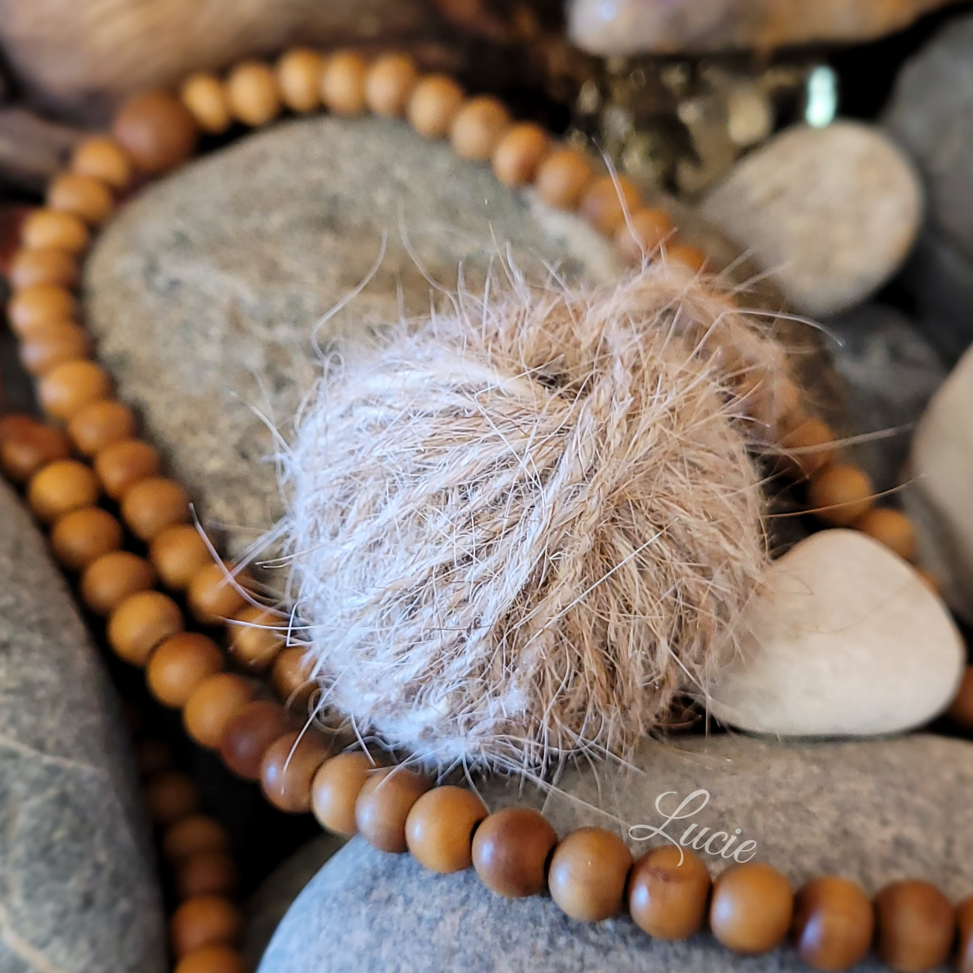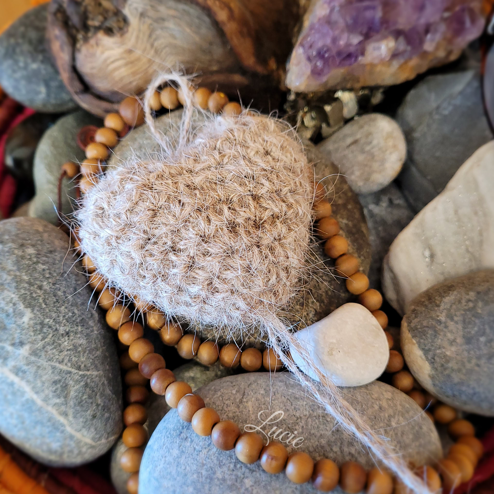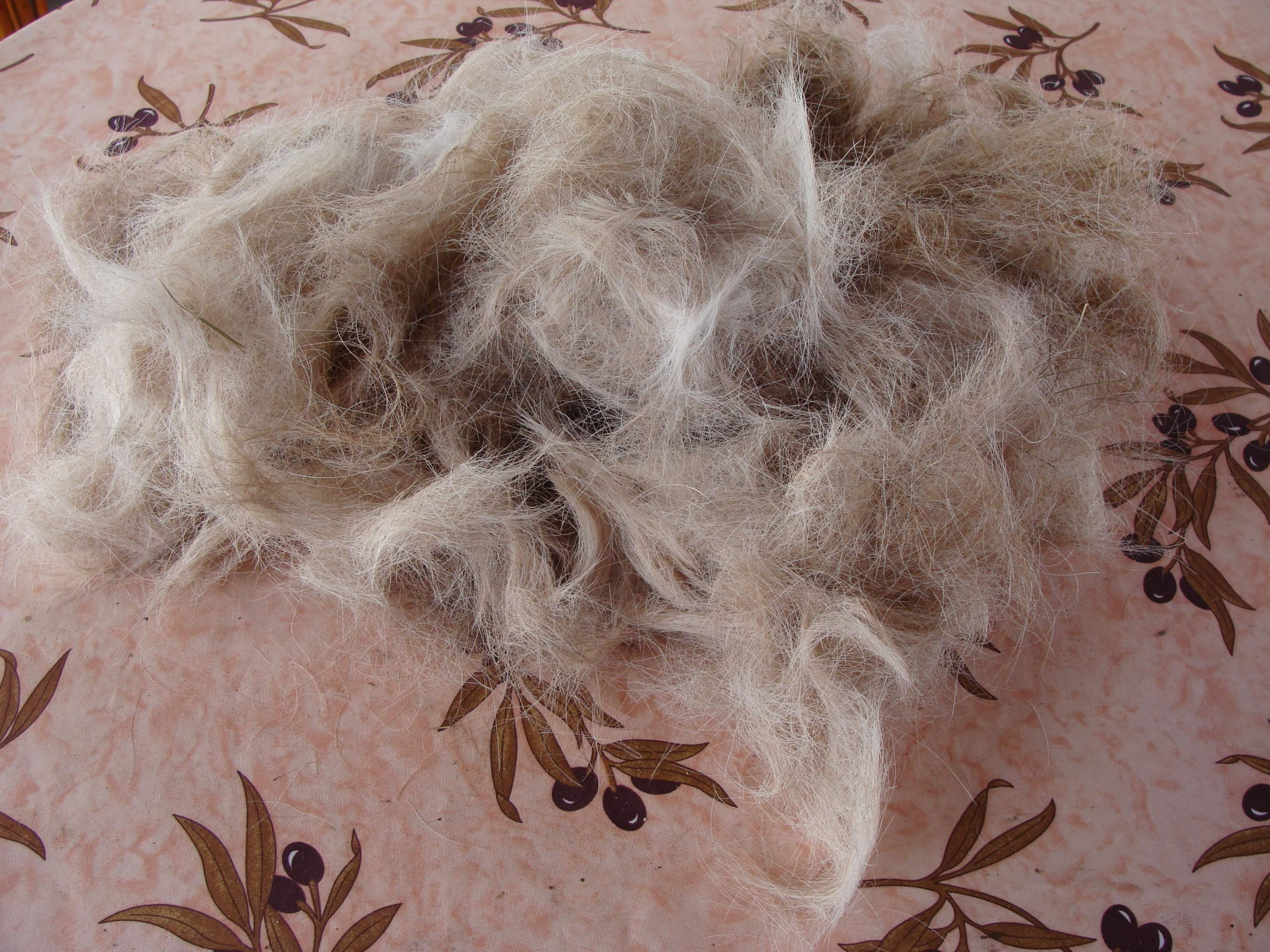 Sa patronne, Catherine, a gardé son poil en espérant obtenir de la laine. Hélas, ce poil n'est pas filable, seul. En le "coupant" avec de la laine de mouton, j'ai pu obtenir un fil, mais il est fragile et pique beaucoup. Avec patience et persévérance, j'ai réussi à confectionner un petit coeur souvenir, garni avec ses poils. ❤