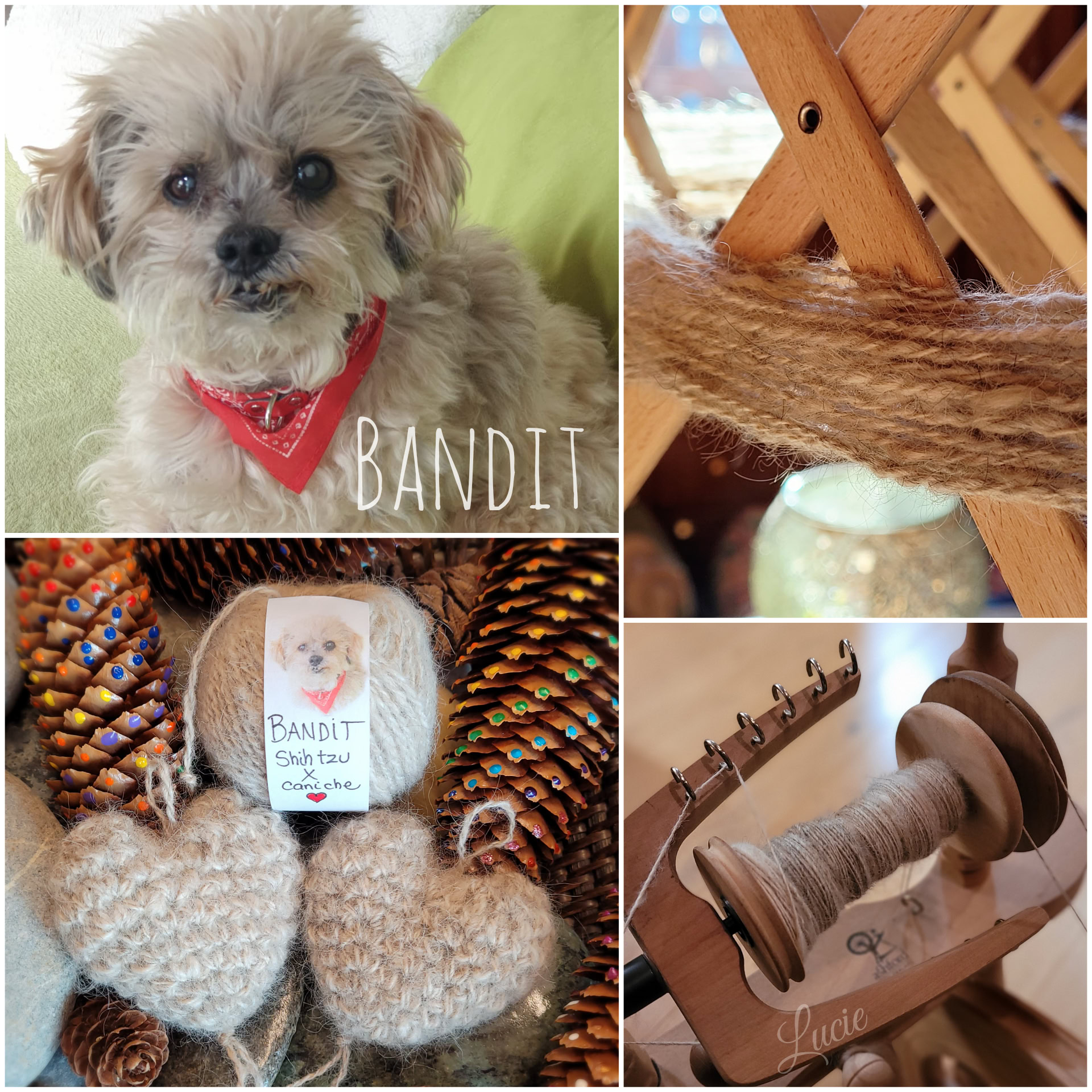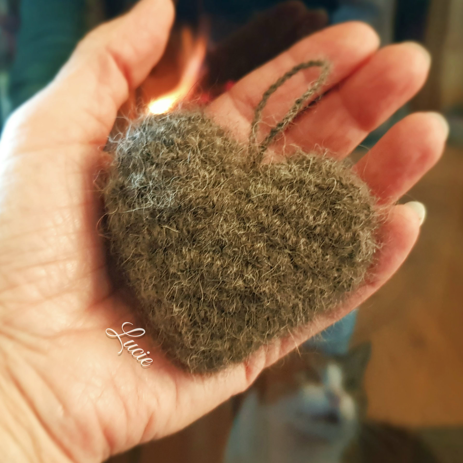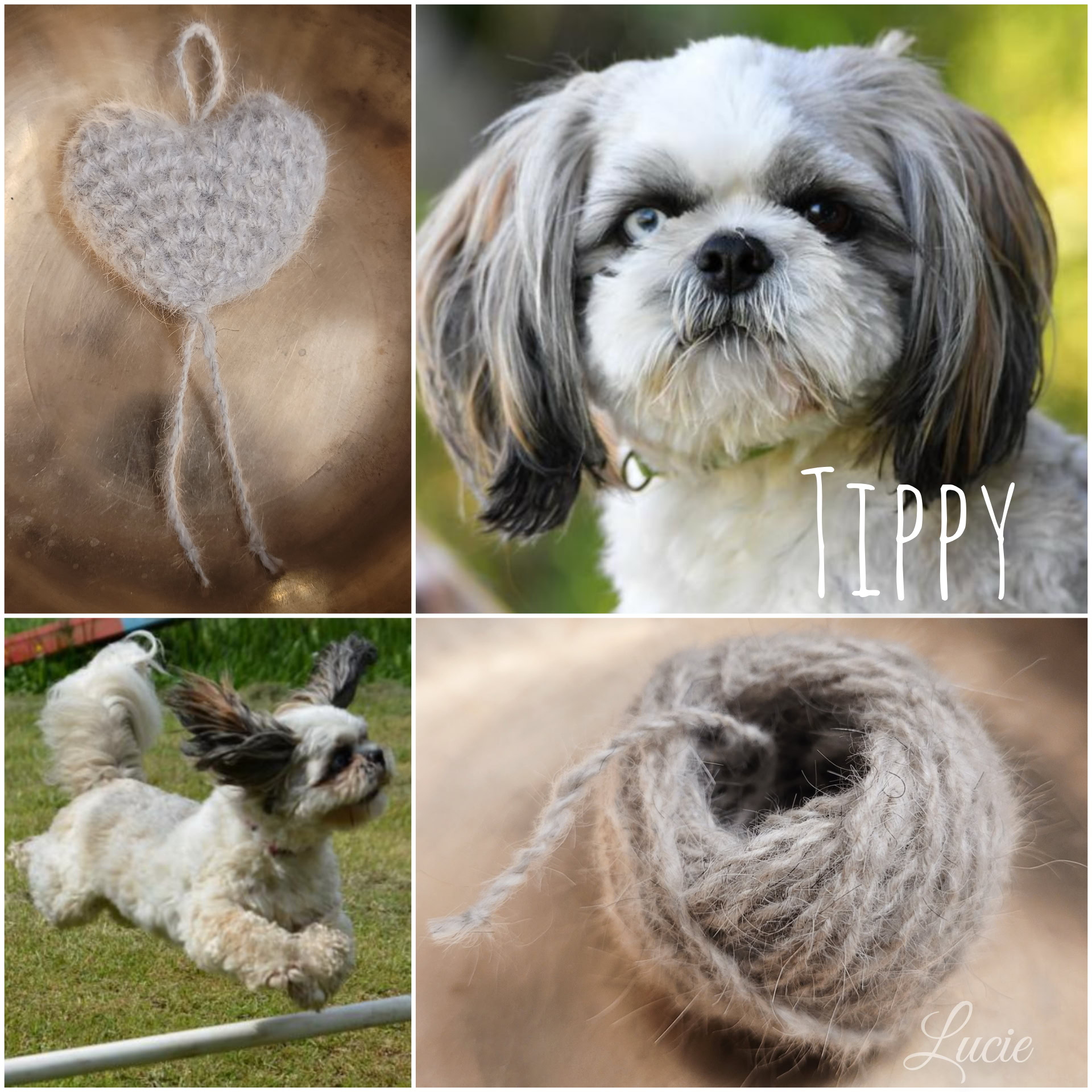 Toutes les races, ne possèdent pas ou peu ce précieux sésame, ils ont plutôt des "cheveux" qui, une fois coupés, produisent une laine rêche et piquante ayant tendance à feutrer. De plus, la tonte va entraîner une multitude de mini poils qui, lors du filage, volent dans tous les sens, j'en avais partout, dans le nez, la bouche, les oreilles... alouette. Je ne me suis pas découragée et ai filé 50g de poils tondus de Tippy, Shih Tzu et crocheter un petit coeur souvenir pour sa maîtresse.