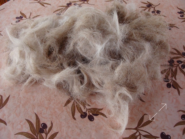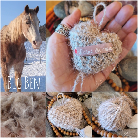 Sa patronne, Catherine, a gardé son poil en espérant obtenir de la laine. Hélas, ce poil n'est pas filable, seul. En le "coupant" avec de la laine de mouton, j'ai pu obtenir un fil, mais il est fragile et pique beaucoup. Avec patience et persévérance, j'ai réussi à confectionner un petit coeur souvenir, garni avec ses poils. ❤
