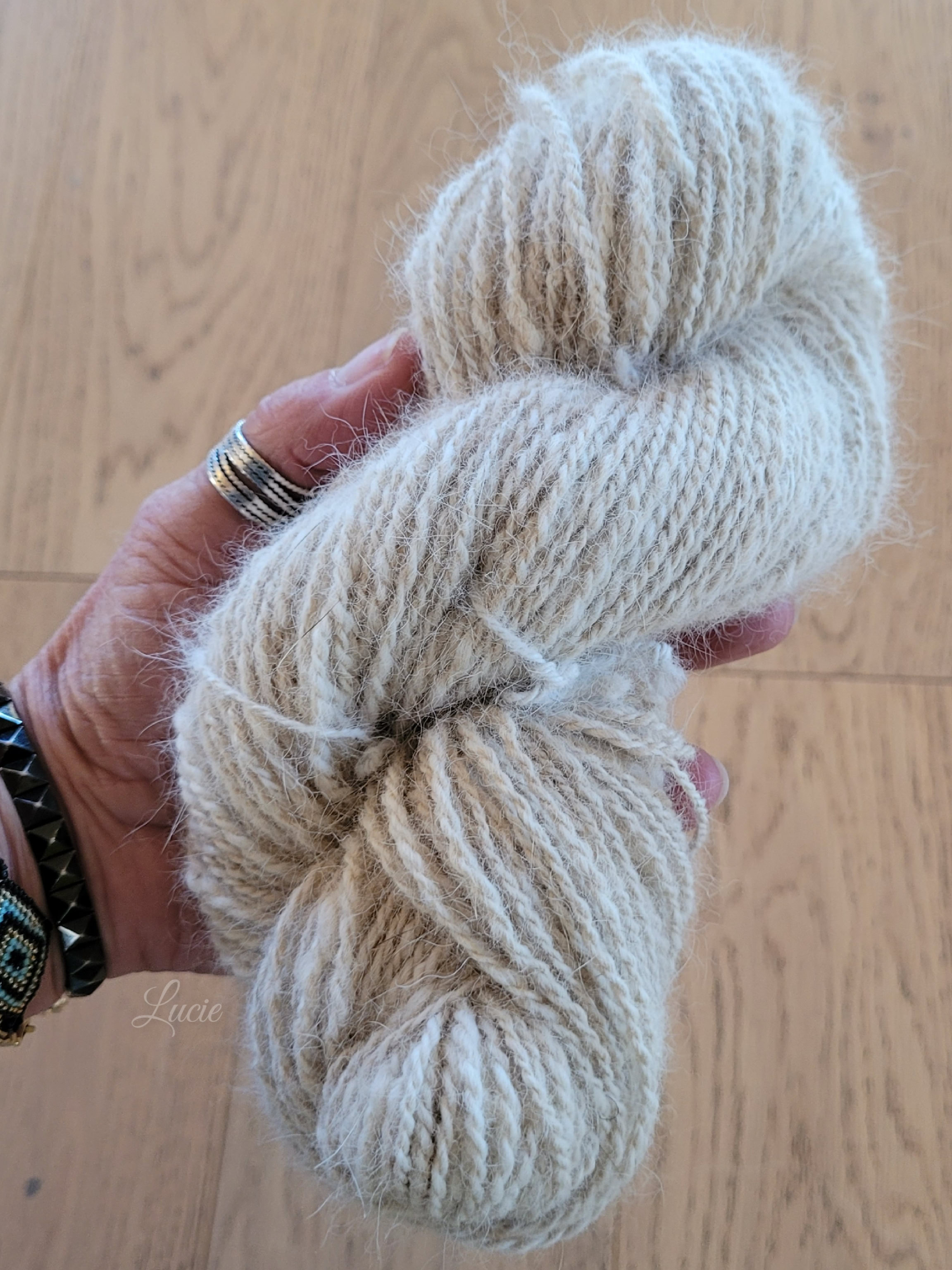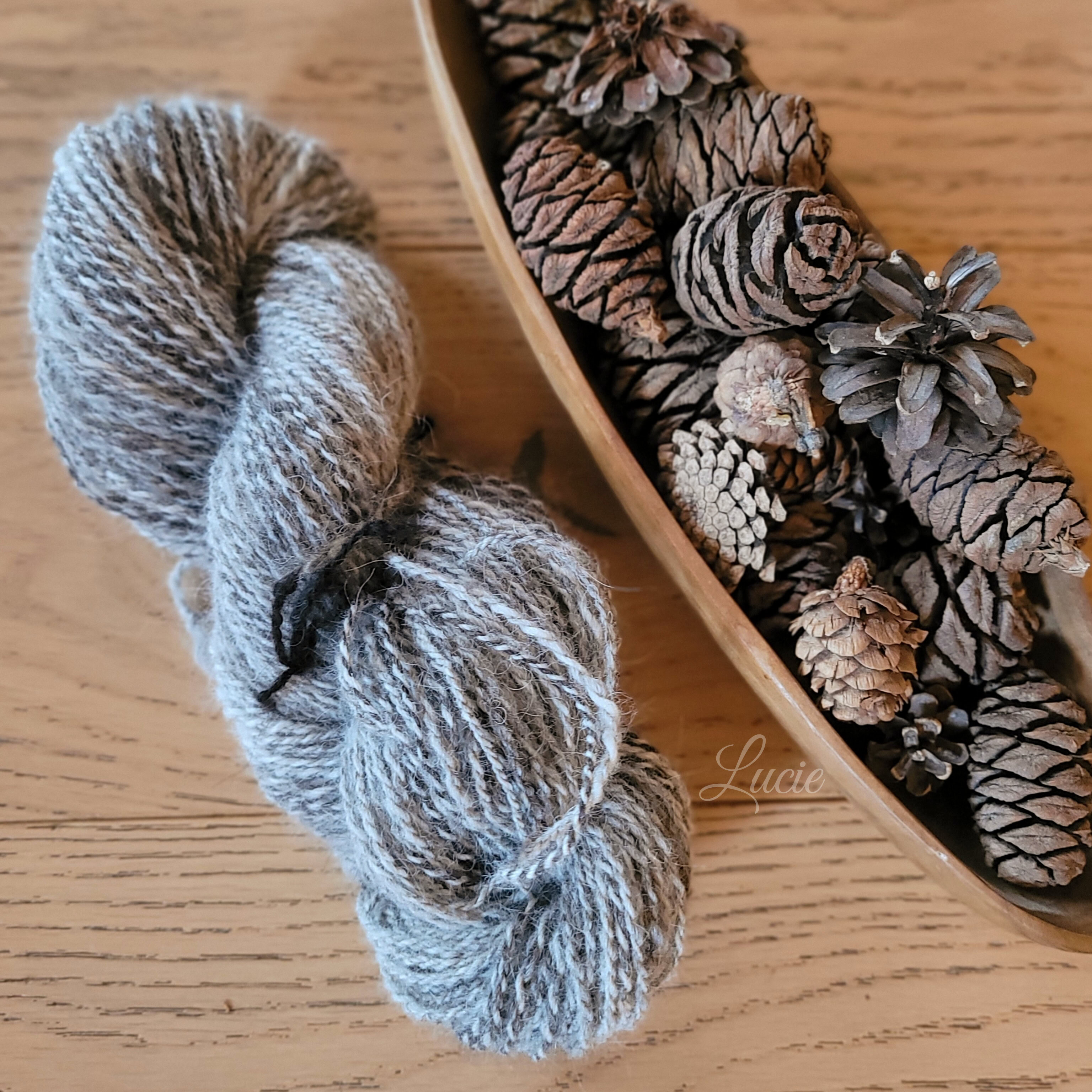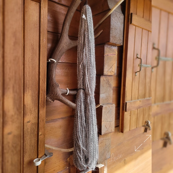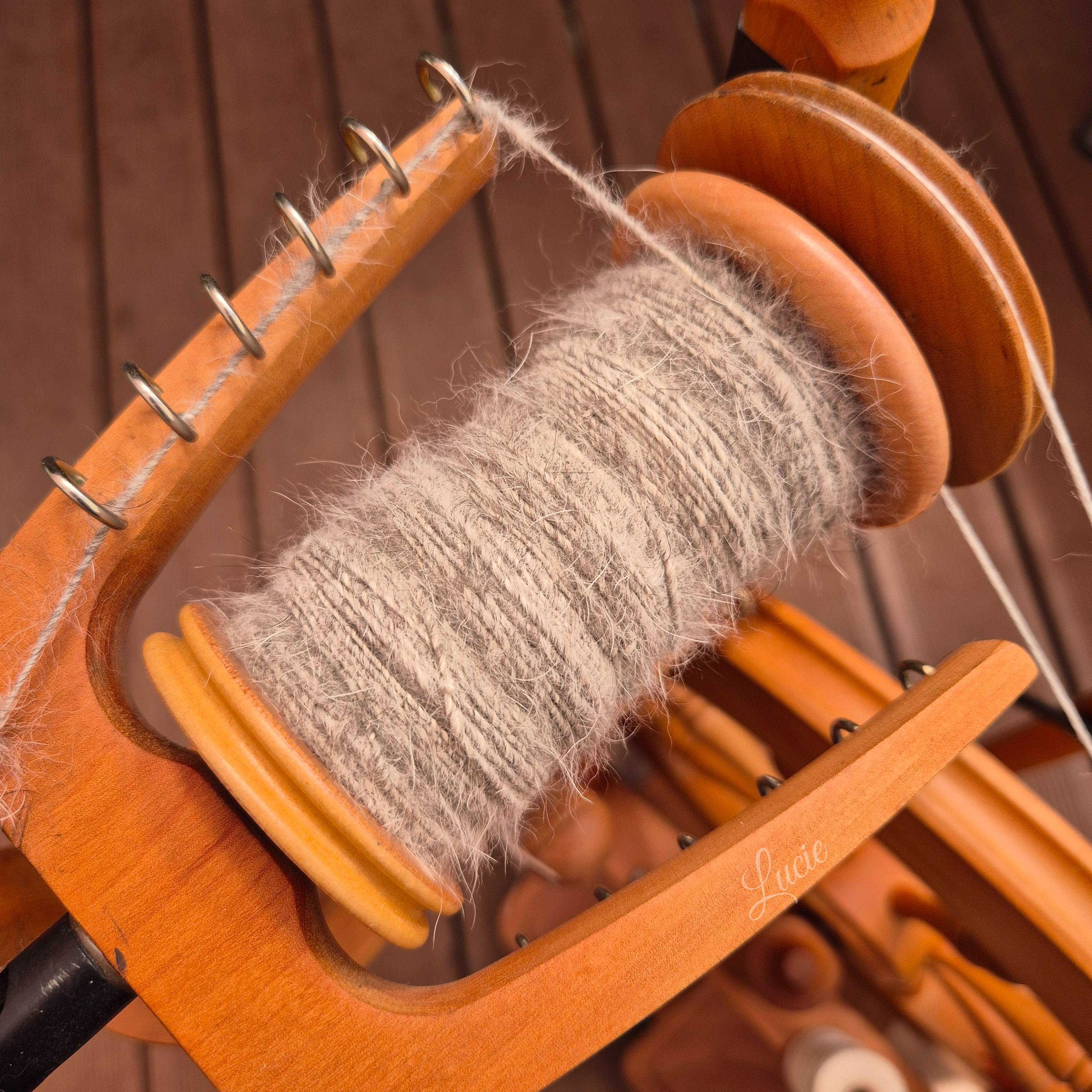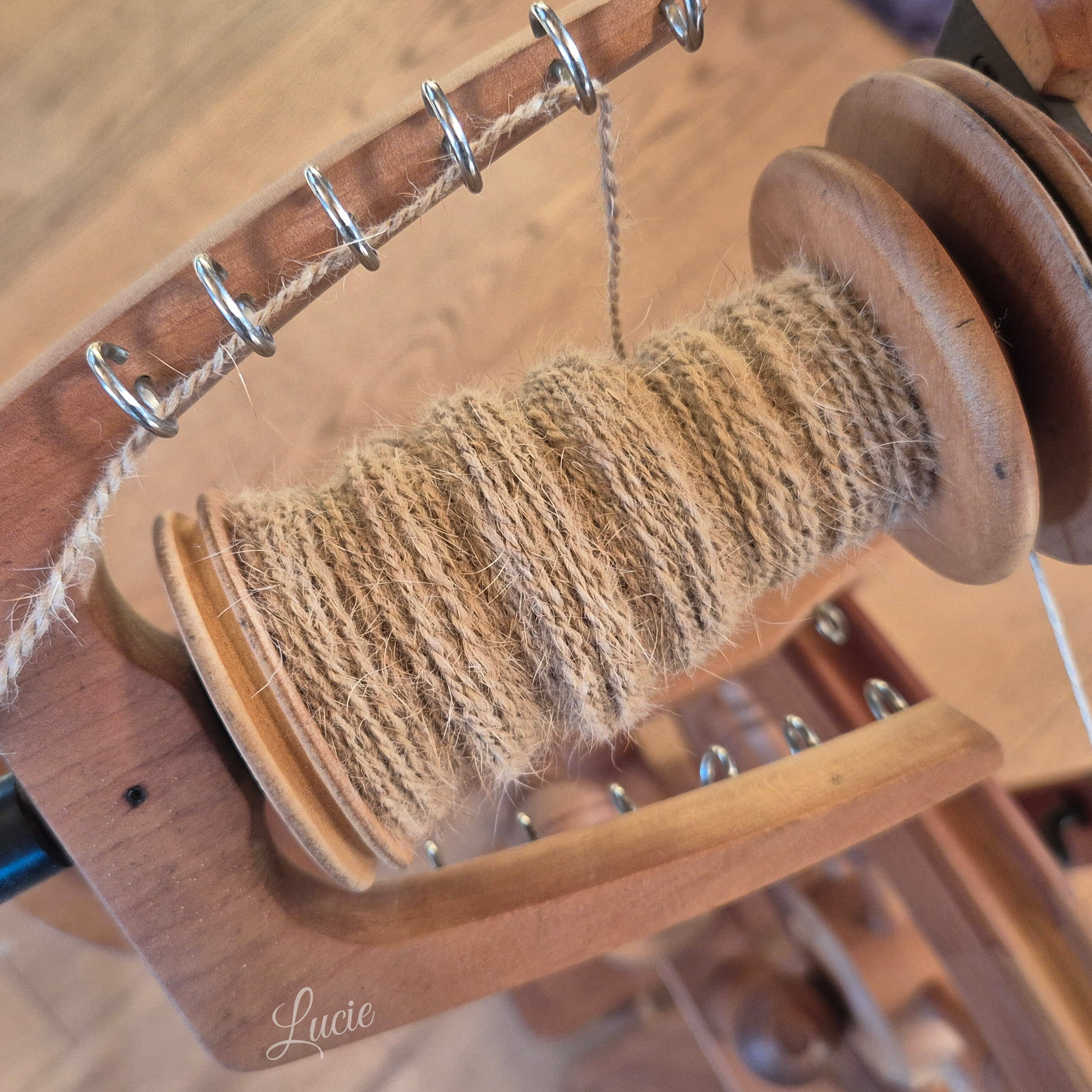 Son sous-poil étant assez court, je l'ai mélangé avec 20 % de laine de mérinos pour une meilleure accroche au filage. Le rendu de la laine est plus solide et moelleux.