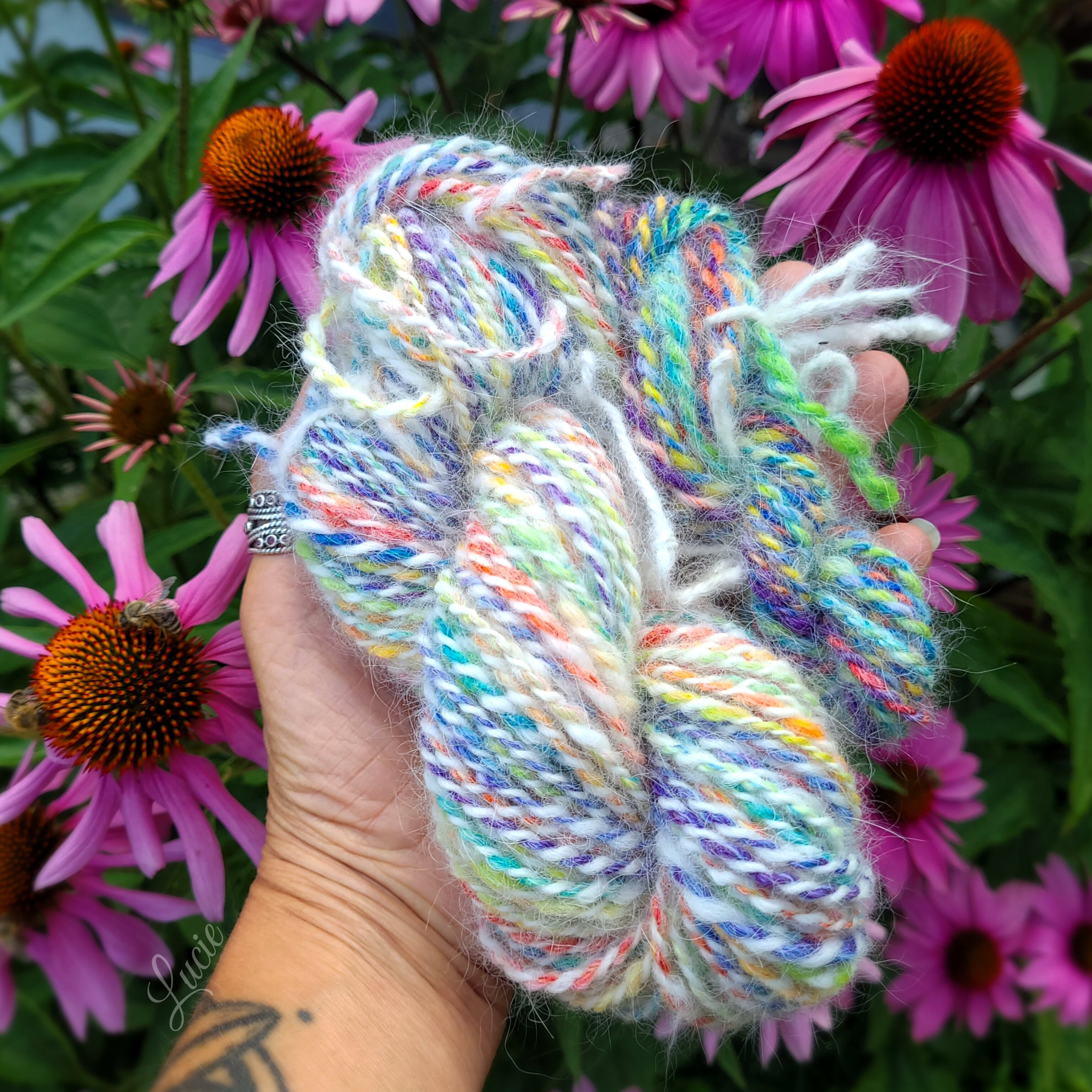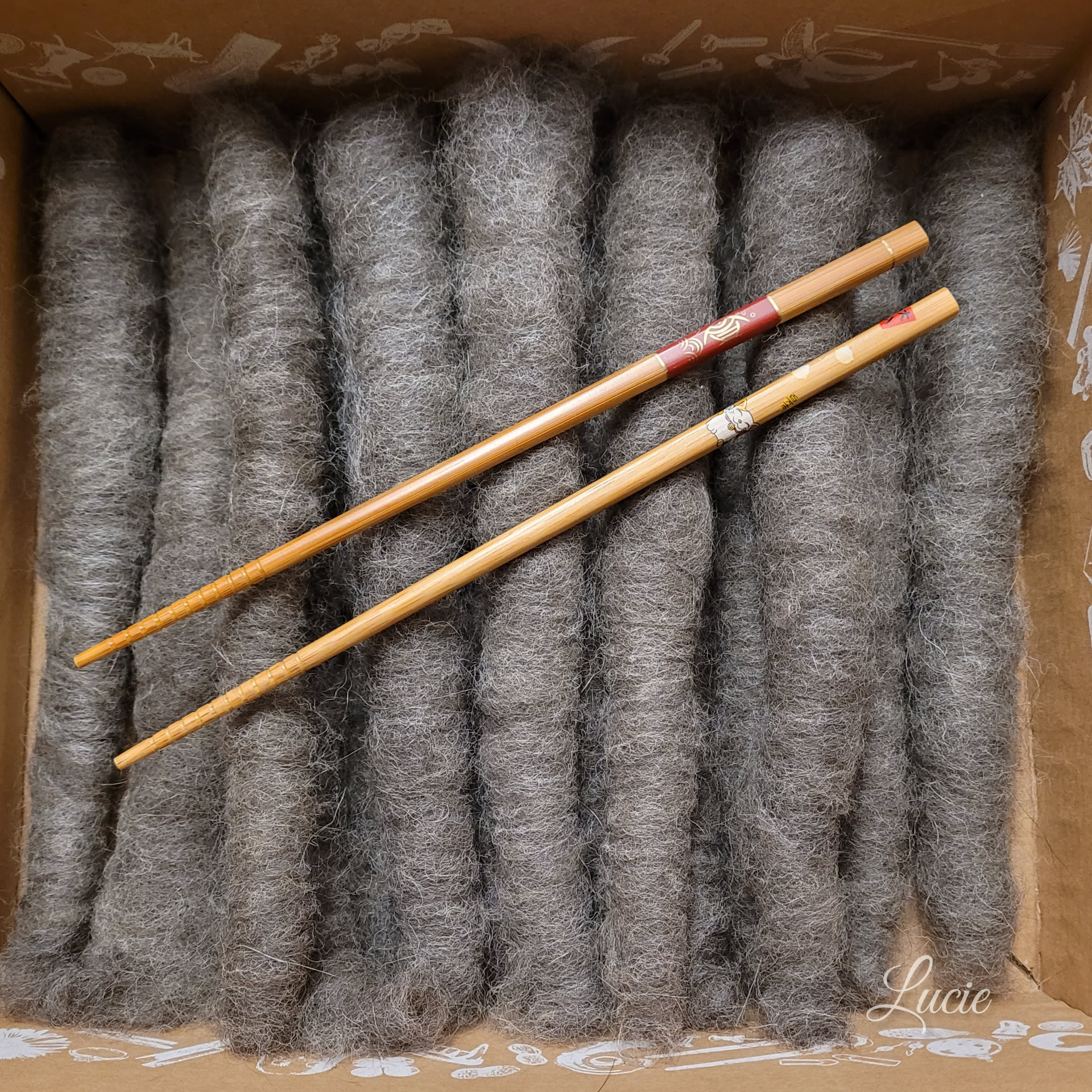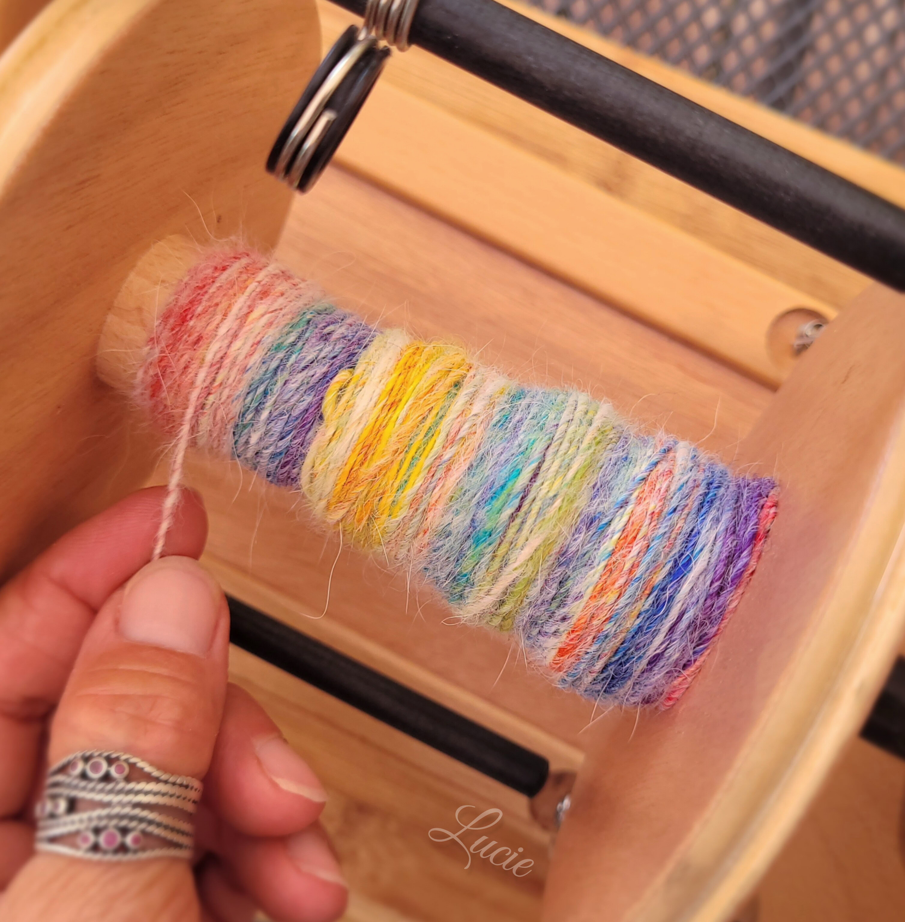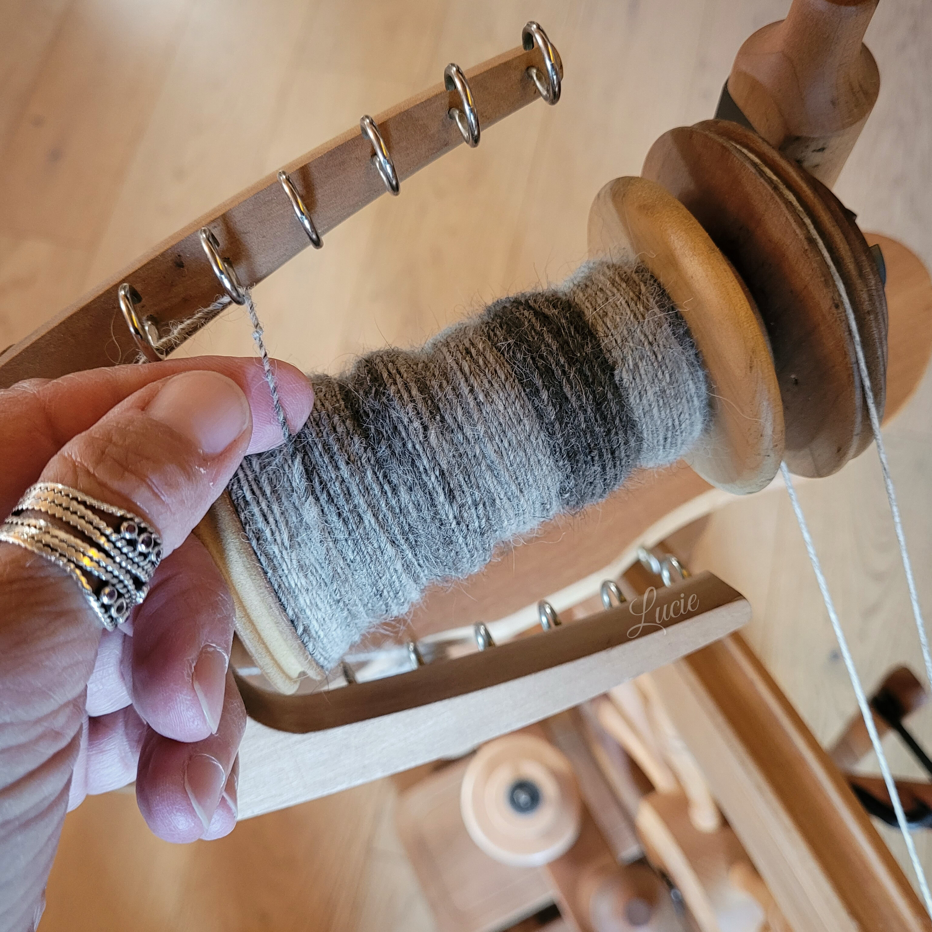 Son sous-poil étant assez court, je l'ai mélangé avec 20 % de laine de mérinos pour une meilleure accroche au filage. Le rendu de la laine est plus solide et moelleux.