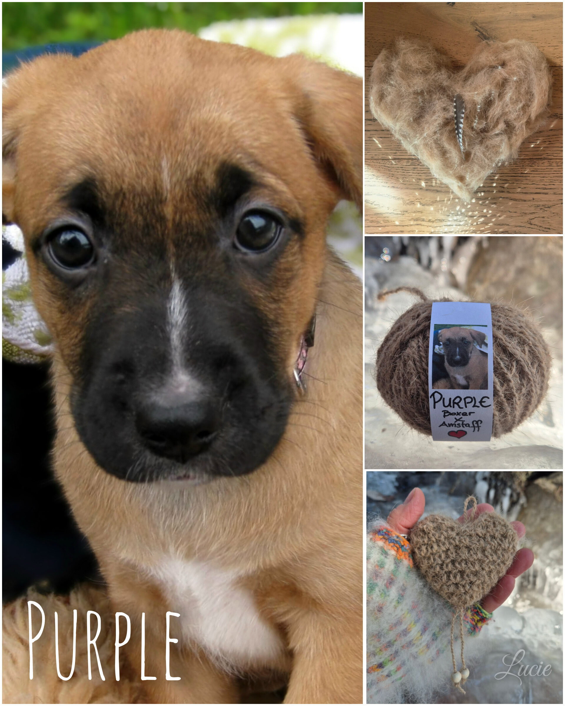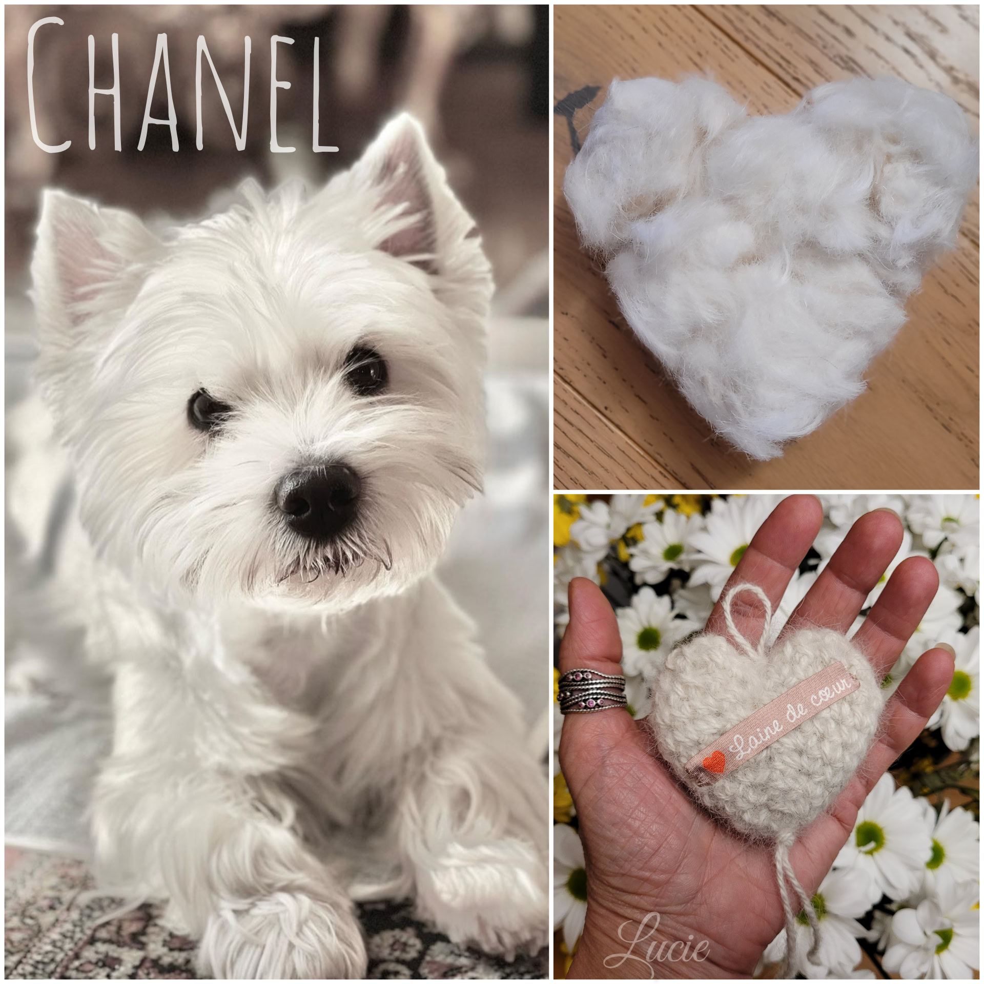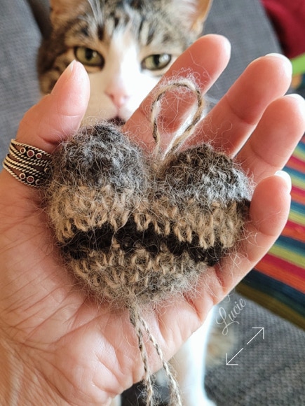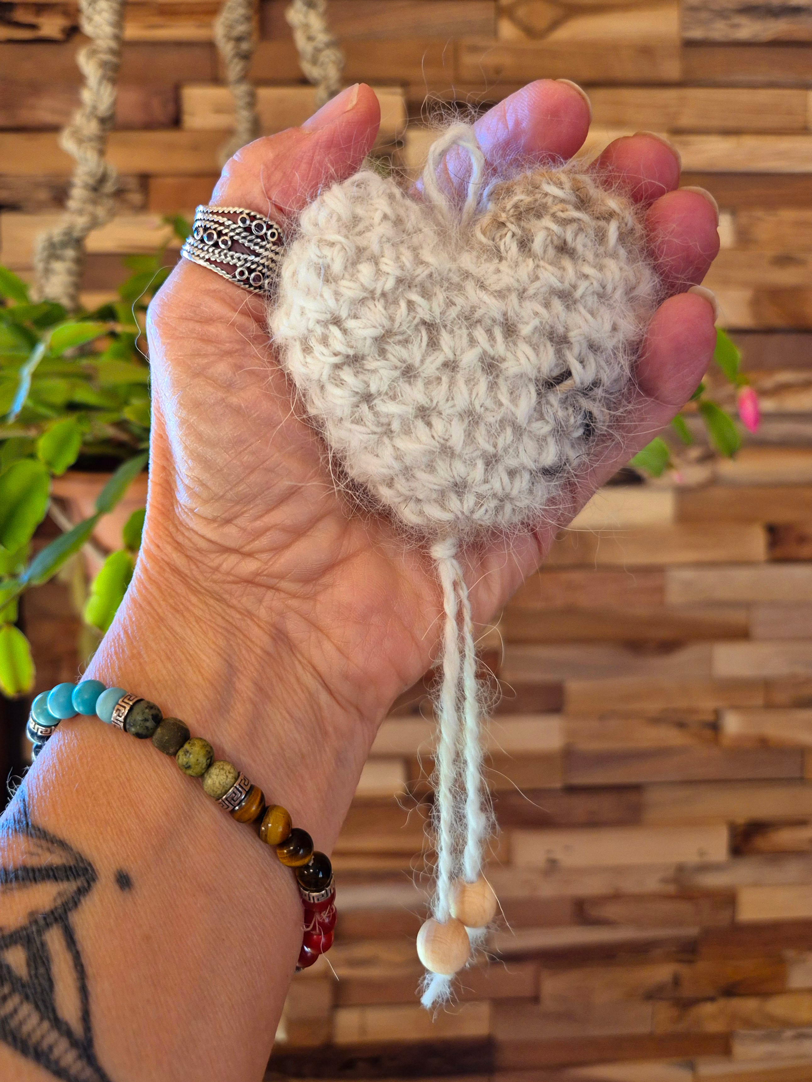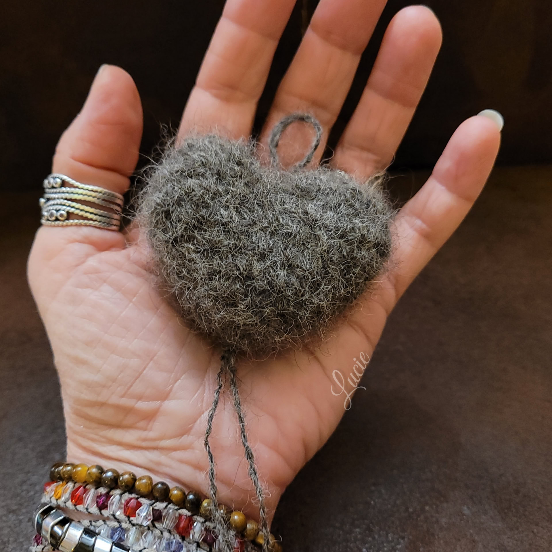 Toutes les races, ne possèdent pas ou peu ce précieux sésame, ils ont plutôt des "cheveux" qui, une fois coupés, produisent une laine rêche et piquante ayant tendance à feutrer. De plus, la tonte va entraîner une multitude de mini poils qui, lors du filage, volent dans tous les sens, j'en avais partout, dans le nez, la bouche, les oreilles... alouette. Je ne me suis pas découragée et ai filé 50g de poils tondus de Tippy, Shih Tzu et crocheter un petit coeur souvenir pour sa maîtresse.