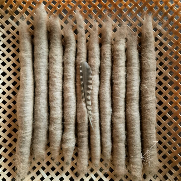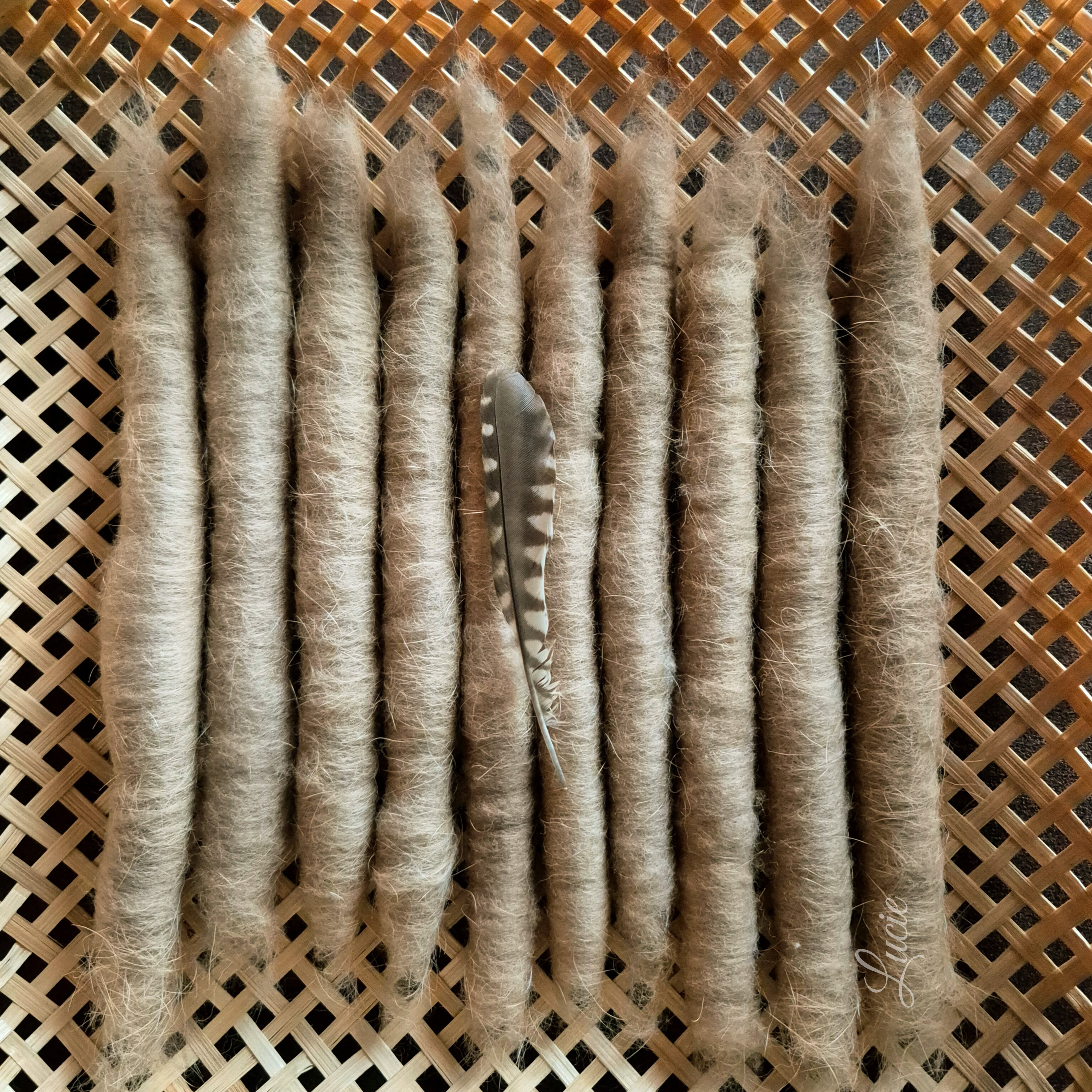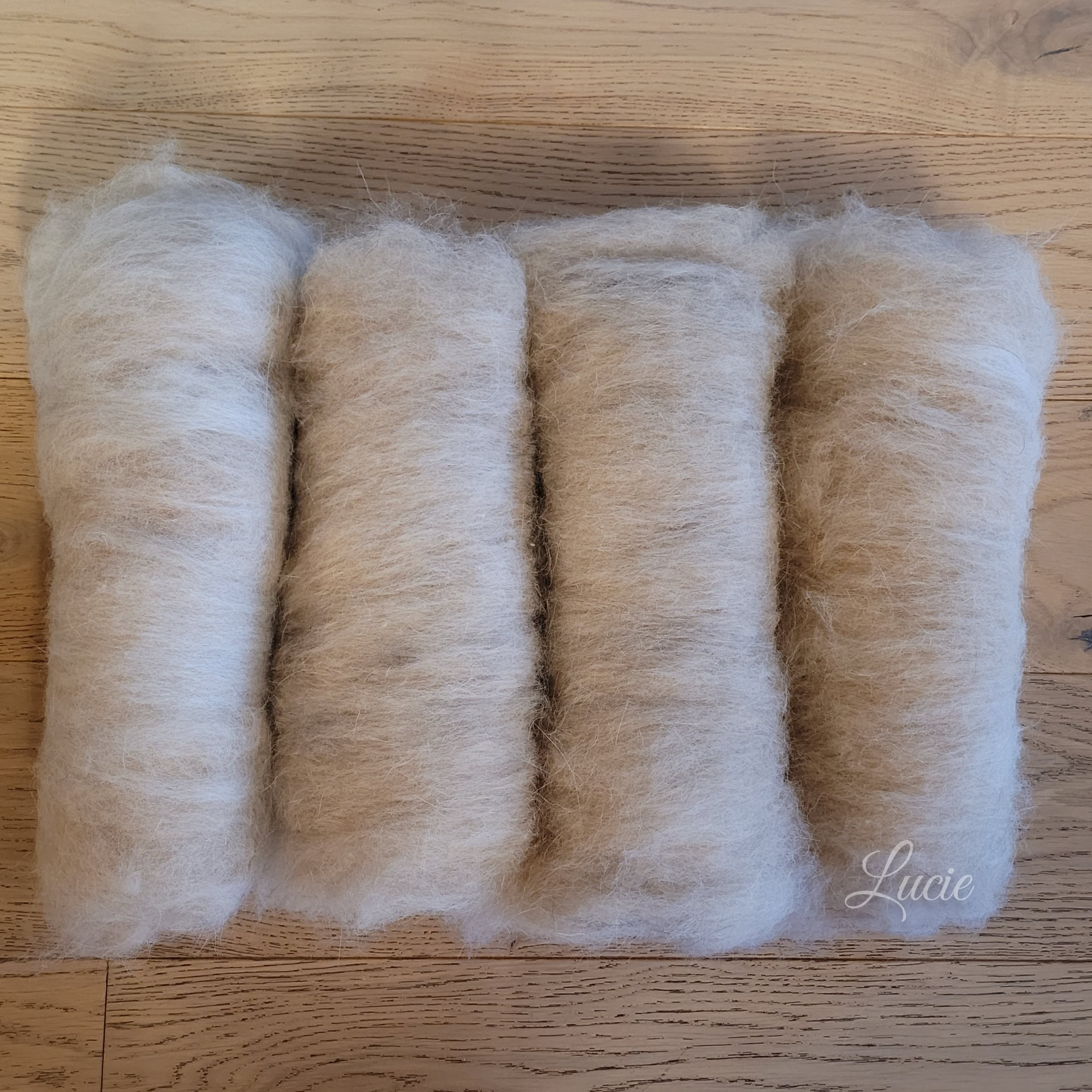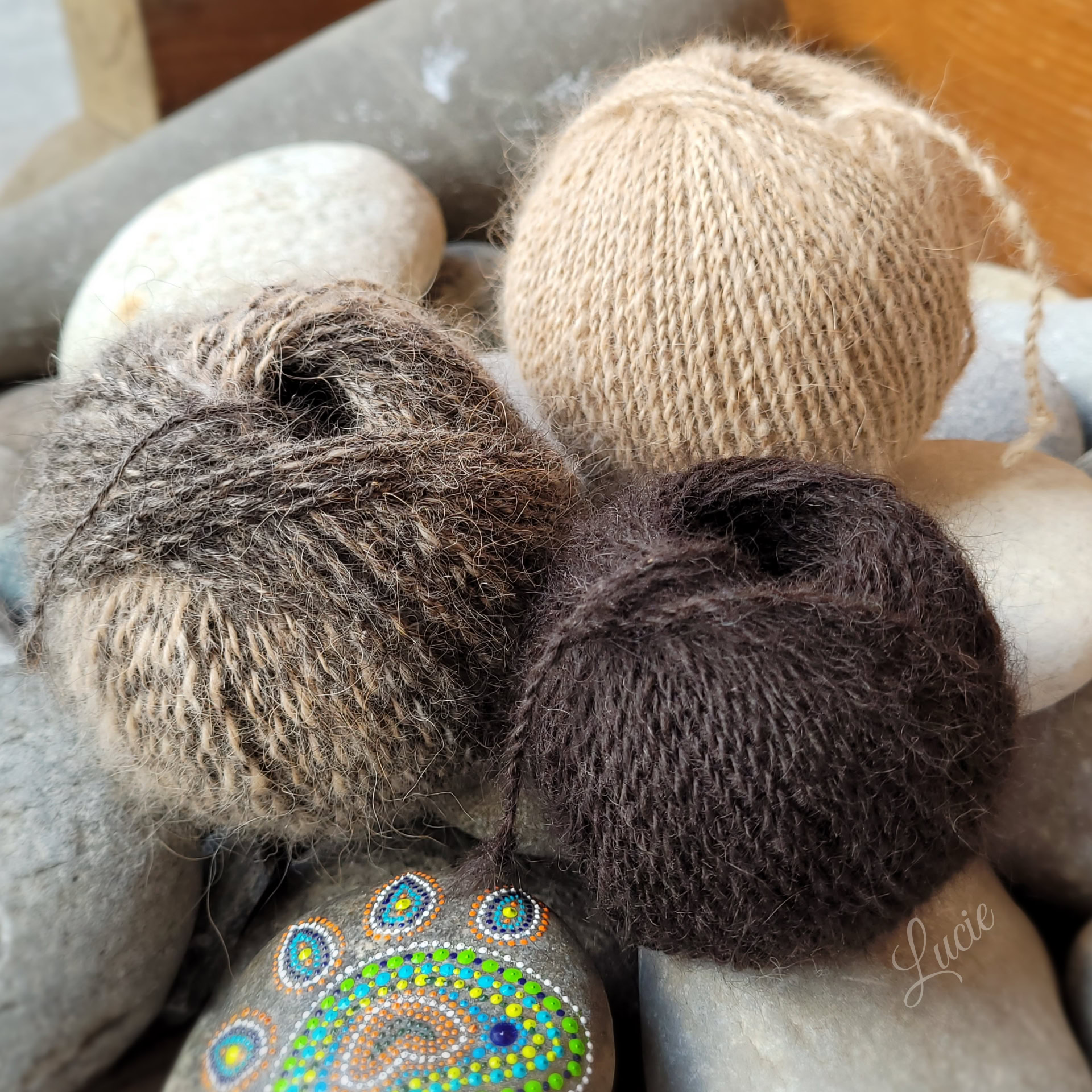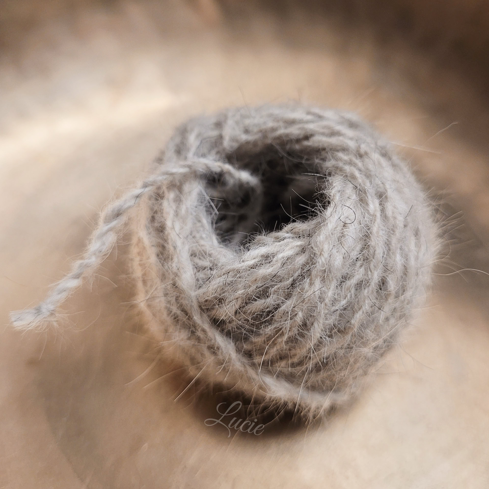 Mon premier essai avec du poil tondu, très difficile à filer et le résultat est très piquant. J’ai pu réaliser ce petit mobile en souvenir. Un deuxième essai avec le poil brossé a été plus convaincant et la douceur était au rendez-vous .
